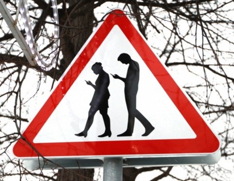 Необычный дорожный знак установлен около конгрессно-выставочного центра «Сокольники» и предупреждает о появлении пешеходов с гаджетами в руках